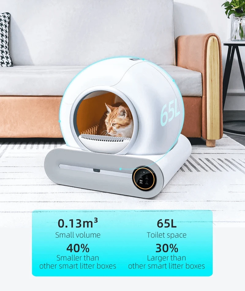 The unique innovative structure of the TechnuPet Automatic Smart Litter Box takes up less floor space, while providing more room inside for your cat.